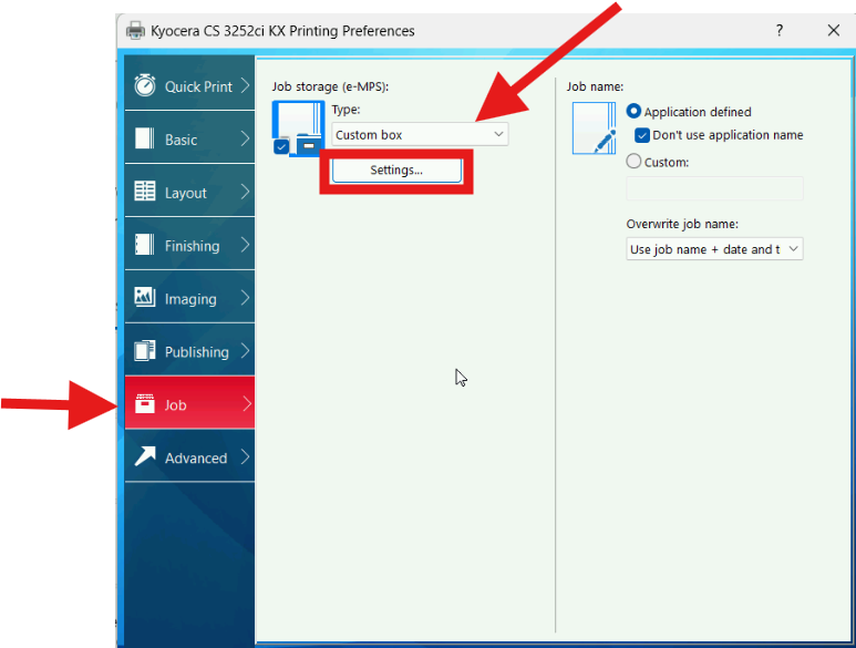 - Step 5: Select the Job tab, check Job storage, and set the Type to Custom Box.