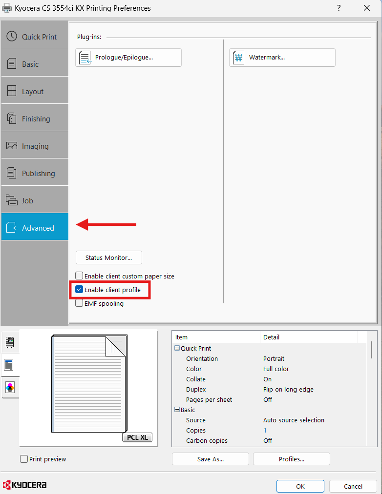 Kyocera printers have the ability to create client profiles to quickly set the paper size, layout, color settings, etc. To use these profiles the printer driver must be configured to enable these custom profiles.